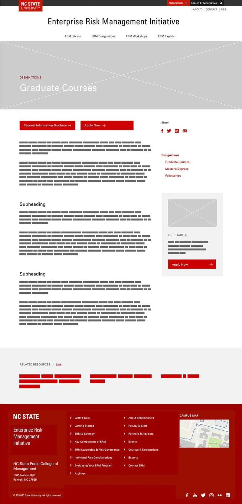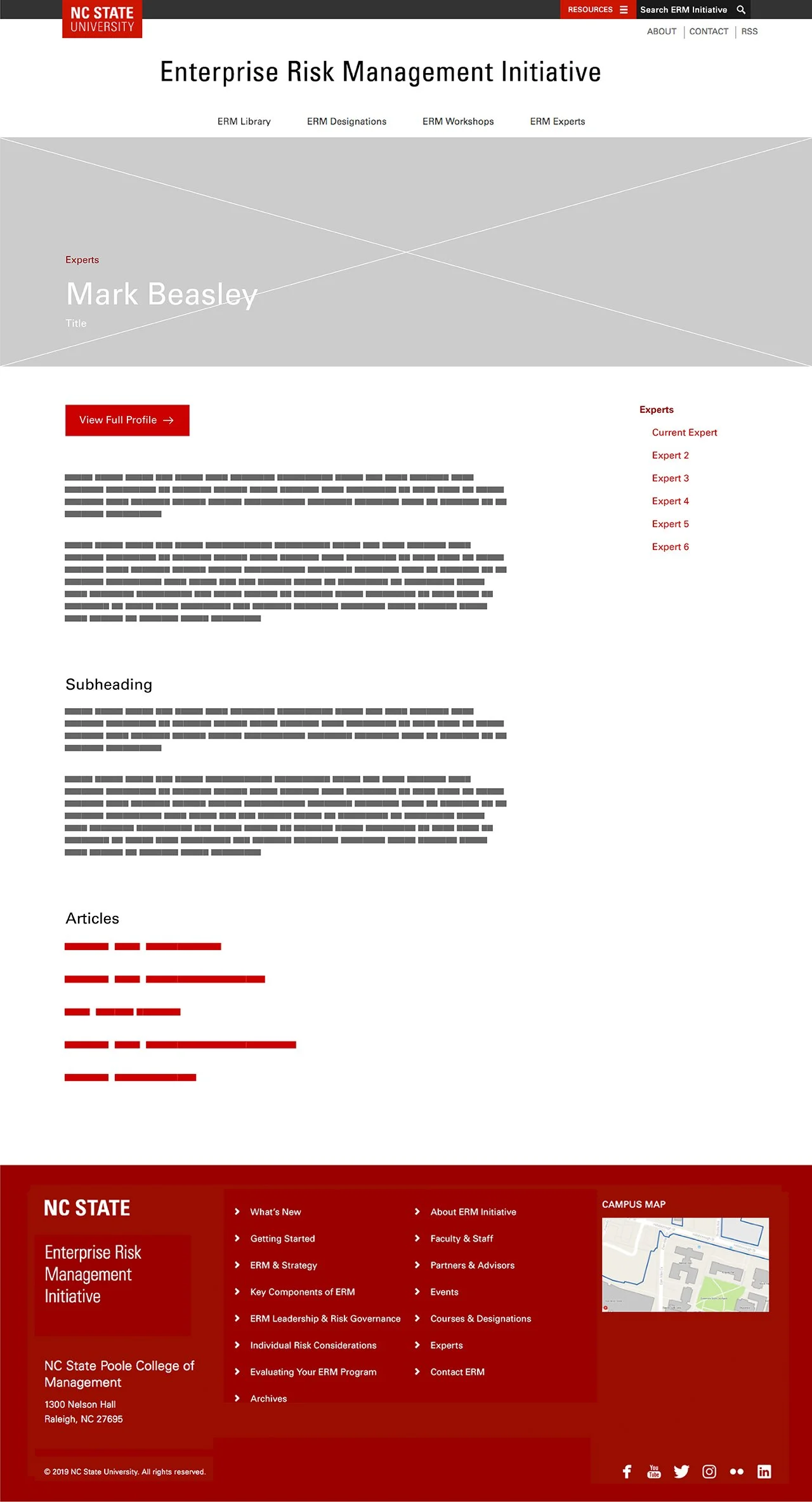 A responsive website redesign elevating digital thought leadership and educational programming in the emergent field of Enterprise Risk Management. We maintained the SEO rankings, incorporated more NC State brand colors through the use of accent colors and full color photography, and restructured the site overall in order to boost the digital resource library.