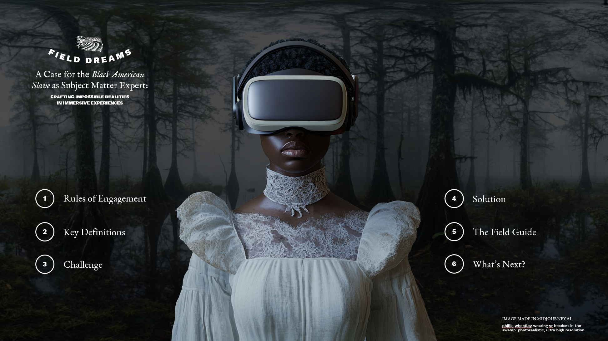 Field Dreams is a research-based graduate Capstone project that merges past literary insight with present immersive practice to position the Black American Slave as Subject Matter Expert (SME) of crafting impossible realities in modern immersive experiences.